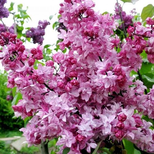 Главное достоинство сорта — необычайно нарядные соцветия. В конце мая куст покрывается крупными метёлками до 25–28 см длиной. Узкопирамидальные, они формируют вертикальные акценты, которые особенно выразительны на фоне плотной листвы. Бутоны удлинённые, пурпурно-фиолетовые, раскрываются в махровые цветки диаметром до 3 см. Каждый цветок собран из двух-трёх венчиков: нижние лепестки отогнуты, верхние изящно закручены к центру. Благодаря такому строению соцветия выглядят объёмными и воздушными. В распуске они кажутся слегка рыхлыми, но в полном цветении приобретают благородную плотность. Аромат у сорта сильный, насыщенный, с классической сиреневой глубиной, способен наполнить сад и сделать его центром притяжения в конце весны.