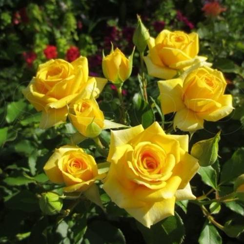 Бутоны розы Шани изумляют своей ярко-желтой окраской, которая неизменно привлекает внимание. Окраска не тускнеет и сохраняет насыщенность даже под ярким солнцем. Цветы имеют классическую форму и диаметр до 3-5 см, что делает их идеальными для срезки и композиционных решений. Махровые лепестки, расположенные в соцветиях, придают цветкам дополнительный объем и текстуру. На одном стебле обычно можно увидеть от 5 до 7 цветков, что создает эффект пышного и богатого куста.