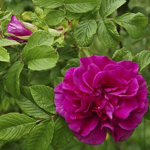 Цветки махровые, крупные — 7–10 см в диаметре, насыщенного розово-пурпурного цвета. Цветение начинается в начале лета и повторяется до первых заморозков. Плотные лепестки формируют объемные чашевидные цветы, а сильный пряный аромат делает куст заметным в саду.